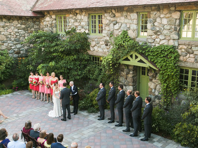 Bride and Bridesmaids arrive at ceremony site. Groom and Groomsmen are hidden.